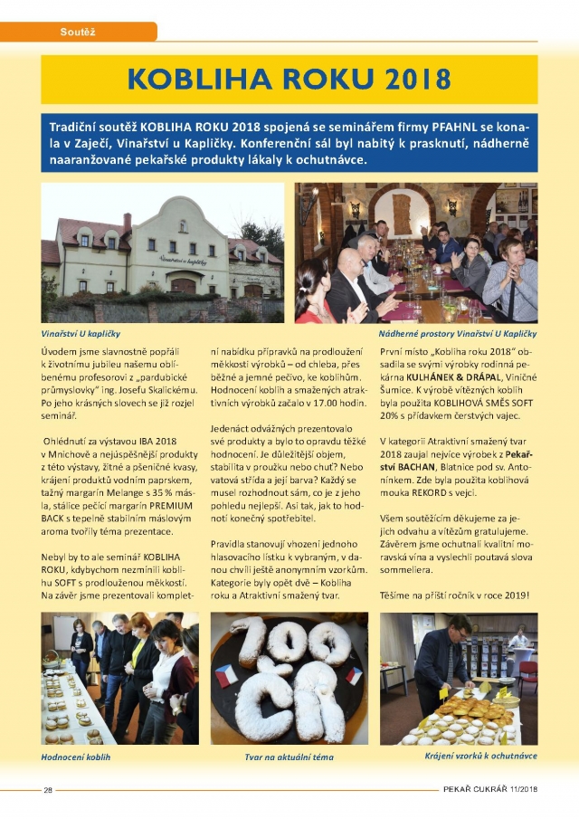 První místo "Kobliha roku 2018" obsadila se svými výrobky rodinná pekárna KULHÁNEK & DRÁPAL, Viničné Šumice. V kategorii Atraktivní smažený tvar 2018 zaujal nejvíce výrobek z Pekařství BACHAN, Blatnice pod sv. Antonínkem.